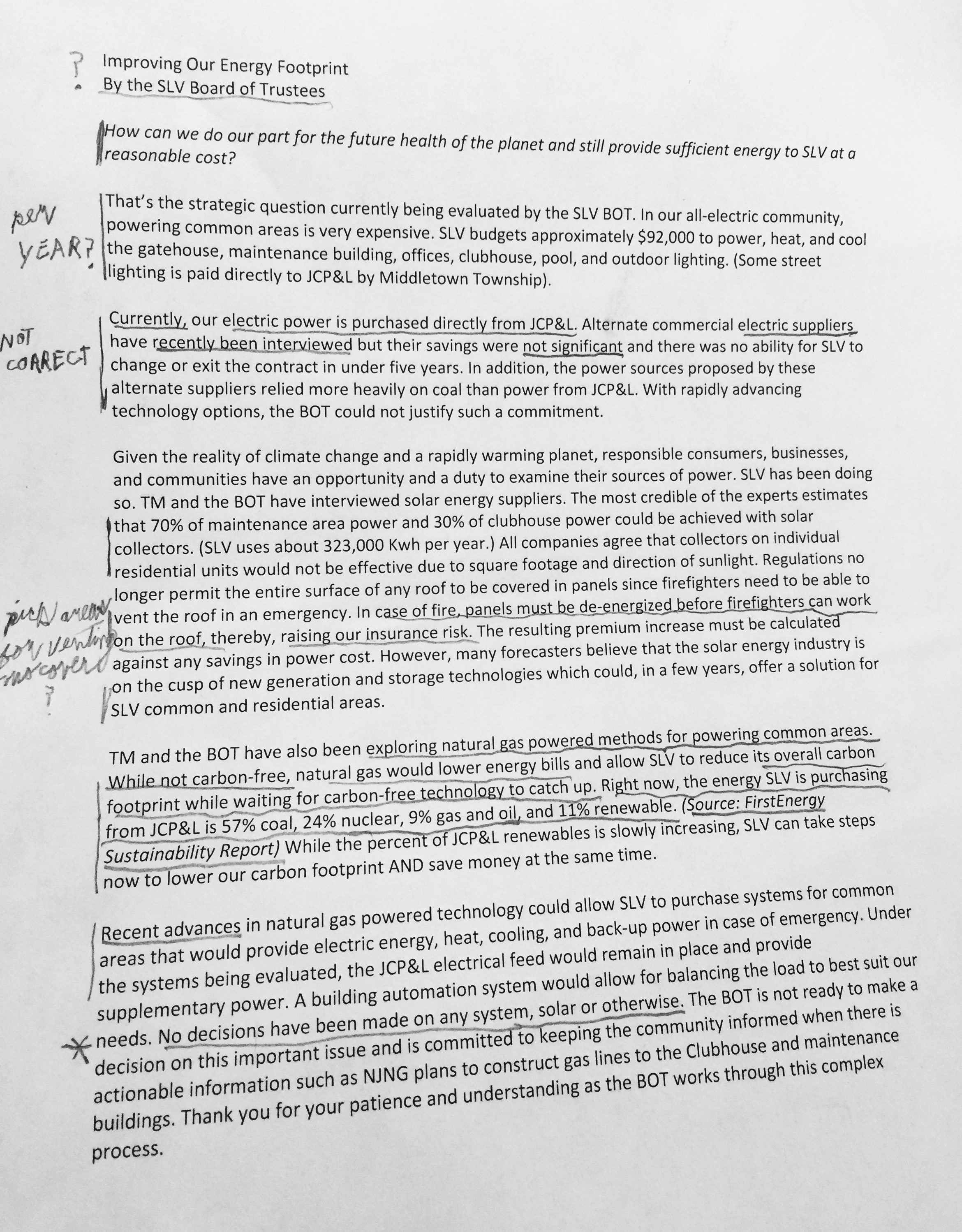 NJNat Gas pushing to bring gas to currently all-electric Shadow Lake – Seth Gerchberg to provide status. Earlier, 300 residents signed letters resisting gas; Shadow Lake Village then sent this letter to residents ; Jan Dash to describe heat pump selection for low cost electric heating (overview-of-heat-pumps); Mary Reilly (trained Communication Leader) to lead messaging discussion. Talking points